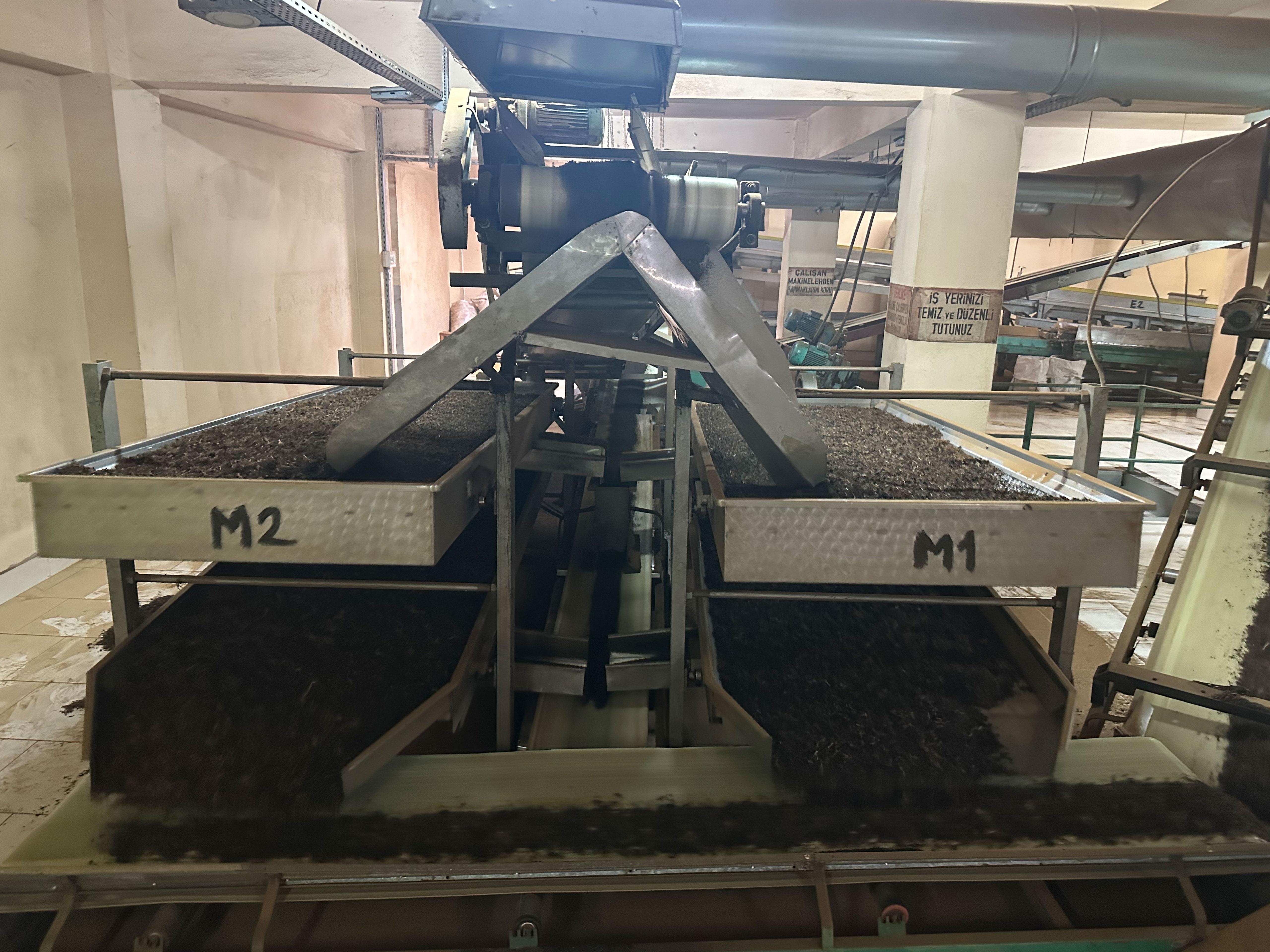 Bu anlatımın ardından fabrikayı gezintiye çıkıyoruz, yudum yudum boğazımızdan akan çay her merhalede buram buram burnumuza geliyor. Aleyna Hanım, daha önce dinlediğimiz siyah çayın serüvenini de her bir makineyi fabrikada göstererek anlatıyor: “Siyah çay beş aşamada yapılıyor. Bunlardan birincisi, öncelikle gördüğünüz bu yeşil duvarın arkasında bize gelen çaylar yaklaşık bir 10 saat işleme alınmadan önce soğdurulmaya bırakılıyor. Daha sonrasında ikinci aşama olarak büyük kazanların içerisinde daha küçük hâllere getiriliyor. Bunun ardından üçüncü aşamada 120 derece sıcaklıklarda çay 4 saat boyunca fermantasyon işlemine bırakılıyor. Bu fermantasyon işleminin sonucunda da çayımız yeşil renginden siyaha dönüyor. Ve ardından dördüncü aşama olarak bant yardımıyla büyük bacalı fırınlarımıza gidip yarım saat 120 derecede fırınlanıp kurutuluyor ve beşinci, yani son aşama olarak tozundan, çöpünden, odunundan ayrıştırılıp doğrudan paketleniyor.”
